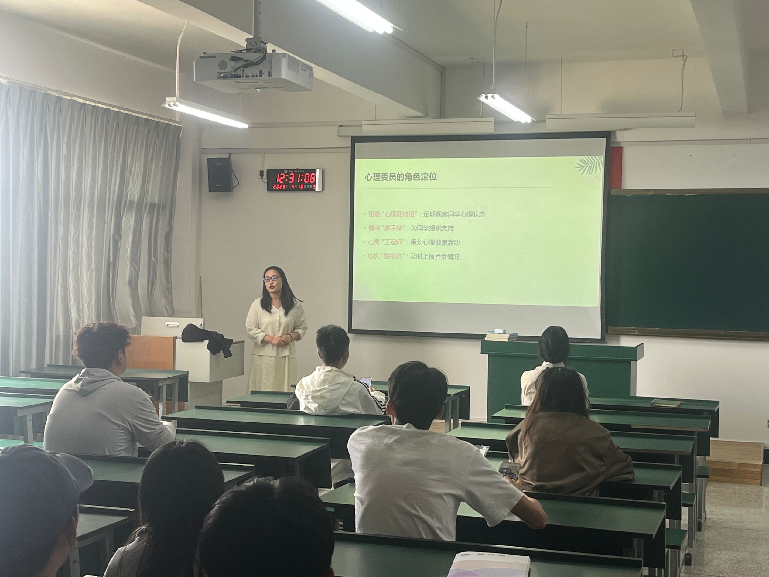 在互动环节,许杨老师鼓励心理委员们结合班级实际情况提问交流。针对大家结合日常工作提出的问题,结合具体案例给予一一解答。她分享了许多实用的沟通技巧和注意事项,反复强调大家在日常工作中要保持敏锐的观察力,用真诚和耐心对待每一位同学,真正成为同学们信任的伙伴。最后,个别心理委员分享了自己在日常观察中发现同学情绪低落,通过主动陪伴、耐心倾听,帮助同学逐渐打开心扉的经历,并呼吁全体心理委员“做有温度的心灵守护者”。