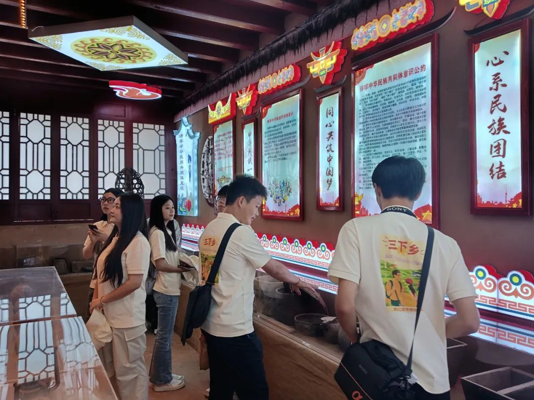 木高古村作为多民族聚居的村落,长期以来各民族和睦相处、互相帮助,是民族团结的生动缩影。实践团来到铸牢中华民族共同体意识主题教育馆,讲解员的讲解串联起馆内珍贵物件。白路镇发展轨迹、多样民族服饰,还有国家级非物质文化遗产彝族民歌、彝族酒歌,一一呈现,每一件展品都让队员们深切感受到“各民族像石榴籽一样紧紧抱在一起”的生动实践。队员们近距离感受了民族团结的深厚底蕴和实践成果,更强化了大家的中华民族共同体意识。