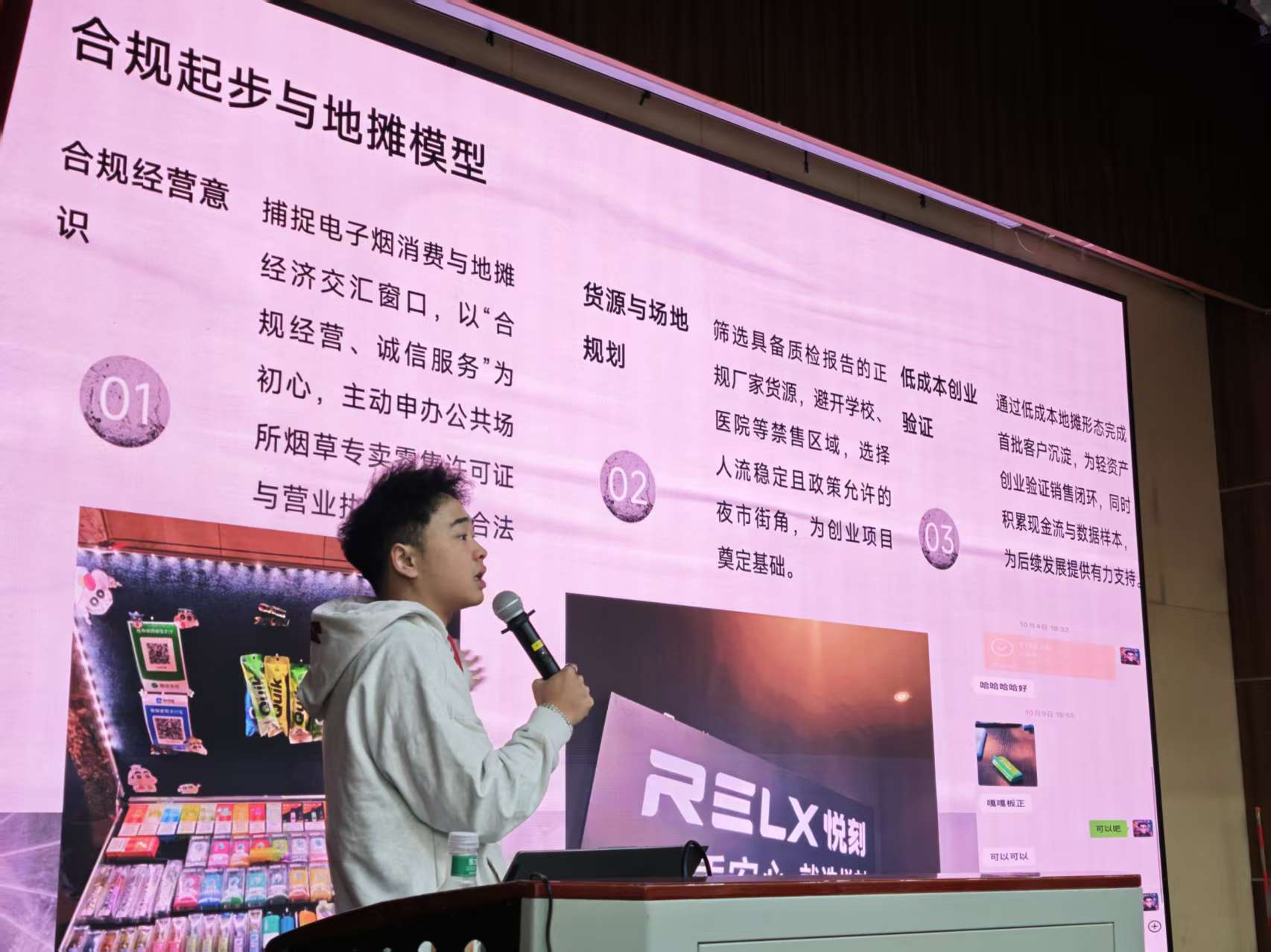 谈及创业初期的积累,余昊隆同学分享的“白天卖酒、夜晚摆摊”经历让现场学子深受触动。为筹措第一桶金,他开启了高强度的奋斗模式:白天奔波于销售市场,晚上则坚守在夜市摊位前,别人深夜十一点就收摊休息,他却始终坚守到凌晨四五点,即便风雨交加也从未间断。这份超乎常人的坚持,不仅为他积累了创业启动资金,更锤炼了直面困难、永不言弃的坚韧意志。