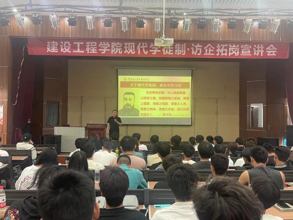 5月14日17:20,彭明兴院长在光荣讲堂为2022级建筑经济信息化管理、地下与隧道工程技术、建筑材料工程技术三个专业的同学们讲解什么是现代学徒制、为什么要开展现代学徒制,以及现代学徒制与岗位实习和就业的关系等内容。