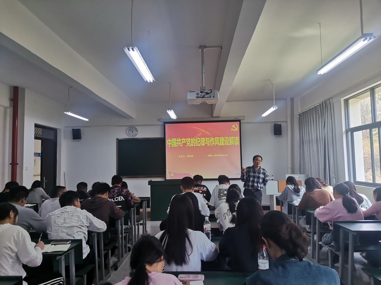 刘艾吉老师宣读了本届入党积极分子培训班的纪律要求和考核方式。接着,党委副书记李洪香为同学们做了开班动员讲话并讲解了第一次党课。他以《中国共产党的纪律与作风建设解读》为题。紧紧围绕纪律作风建设的重要意义,举实例、摆事实,用图片和文字相结合的方式,深入浅出、娓娓道来,系统阐述了以党的六大纪律和五大作风为核心的专题党课。并预祝本届入党积极分子培训班的同学们学有所成、学有所获。