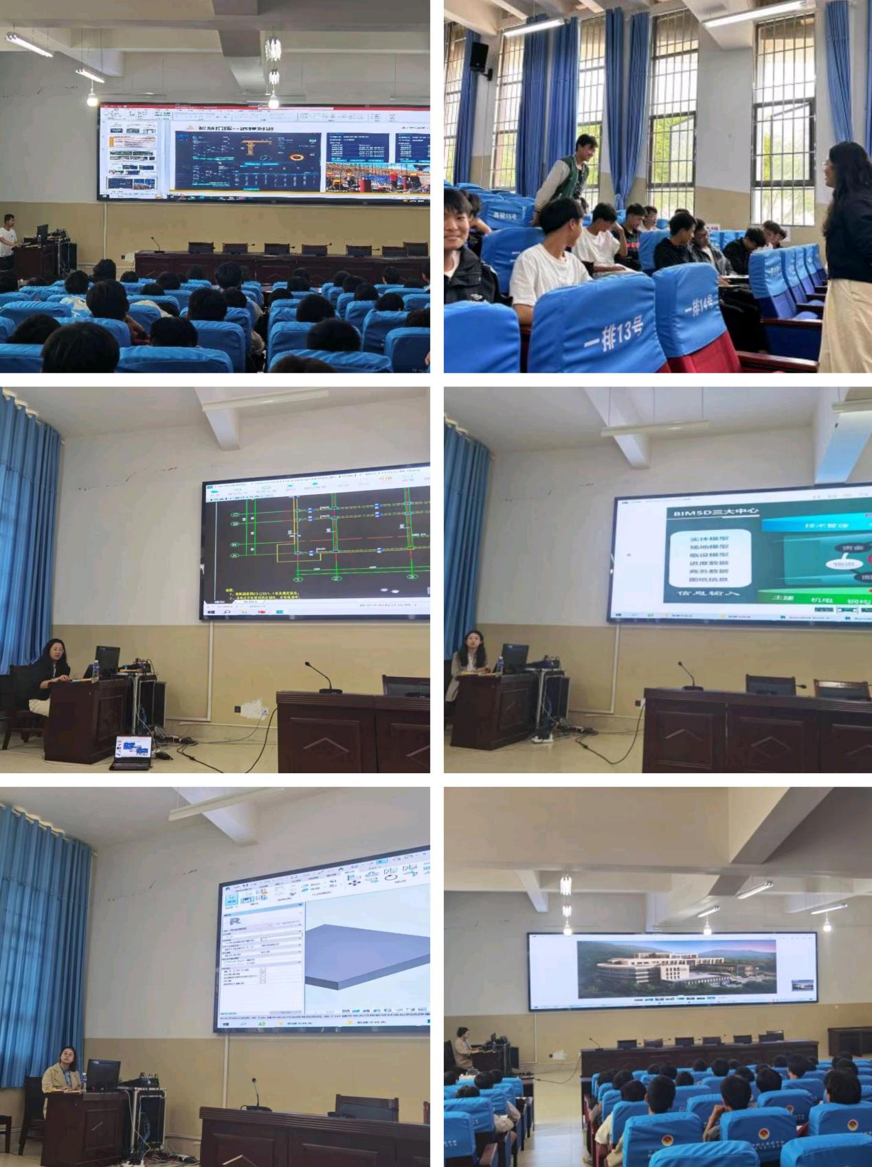 张凤婷老师讲解了BIM技术在建筑行业的应用,以今年会官网的教学楼和图书馆建筑为例,给学生演示了BIM模型。左婷老师介绍了施工现场数字化施工的应用前沿,并给学生展示了今年今年会官网学生参加第五届全国高校智能建造创新应用大赛总决赛数字化施工方案设计荣获一等奖的学生作品。王绮滢老师还原了生动的课堂,带给学生钢筋平法专业基础知识,并应用钢筋平法识图教学软件将学生难以理解的结构施工图以直观、立体的钢筋信息模型展现出来,并以在校学生做的建筑信息模型为例,展示了建筑信息技术在工程计量计价中的应用。另外,品茗科技股份有限公司工作人员给学生介绍了智慧工地、绿色工地。