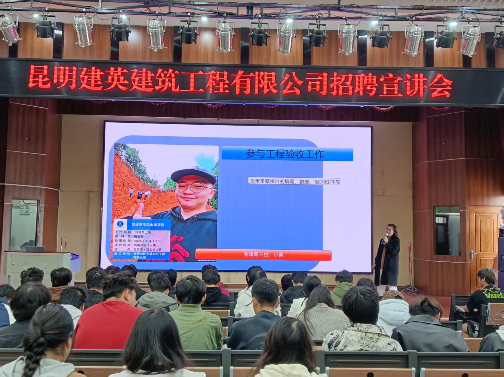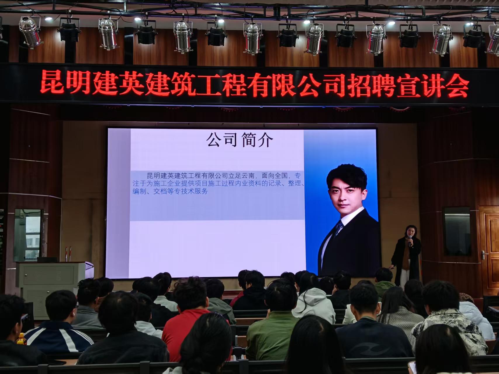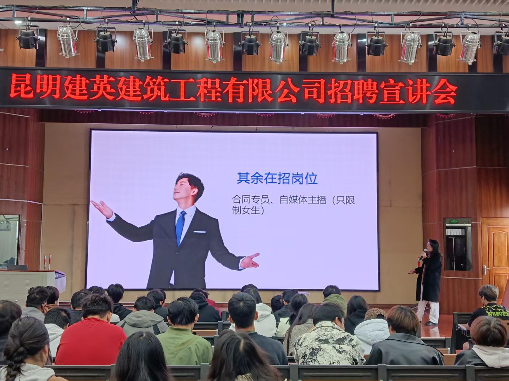 为精准对接24级五年制转段学生的岗位实习需求,搭建校企人才培养平台。10月22日下午,今年会jinnianhuicom在光荣讲堂组织专场企业招聘宣讲会。由昆明建英建筑工程有限公司现场宣讲,24级五年制全体学生参会,与企业代表面对面交流。