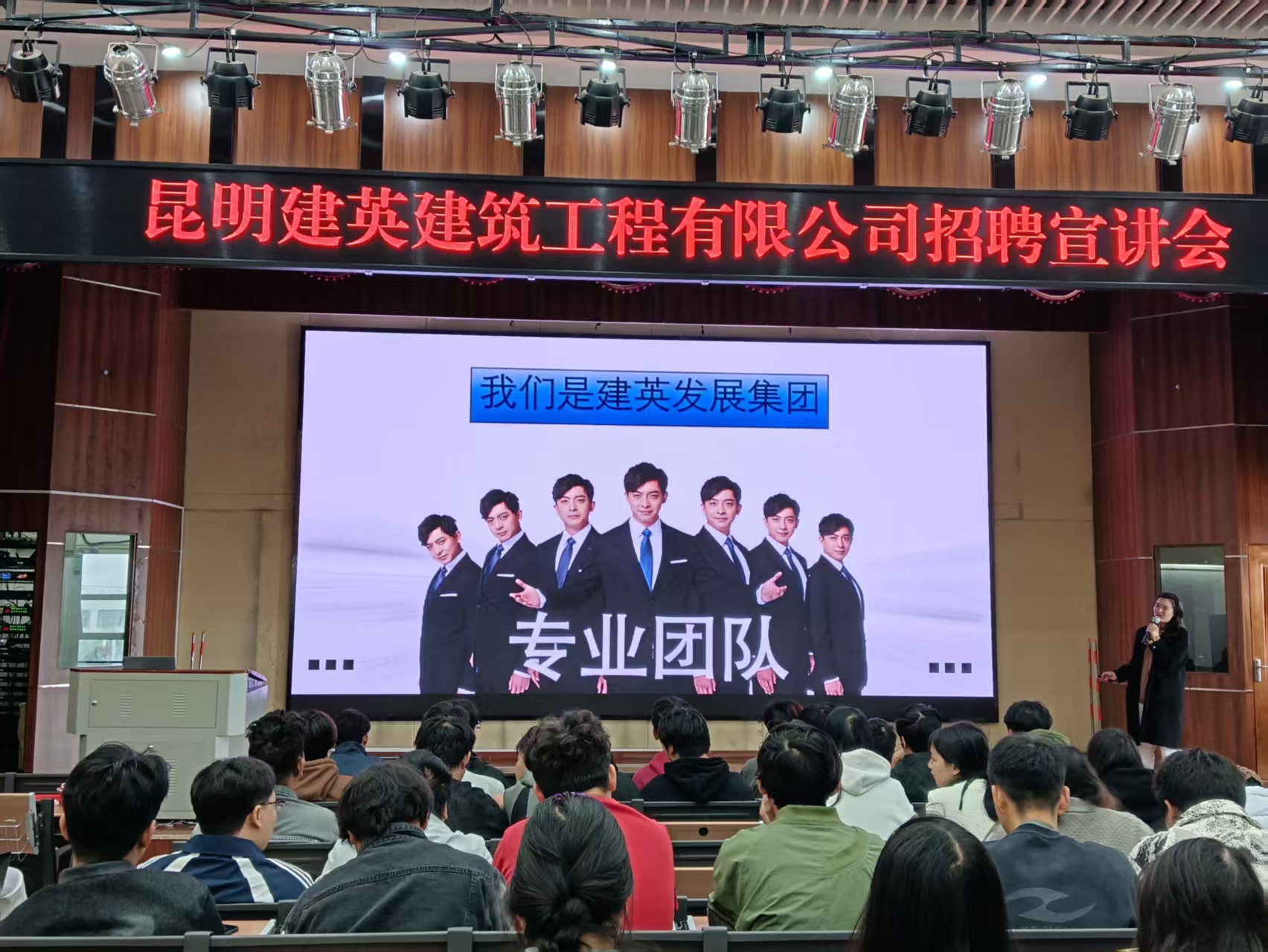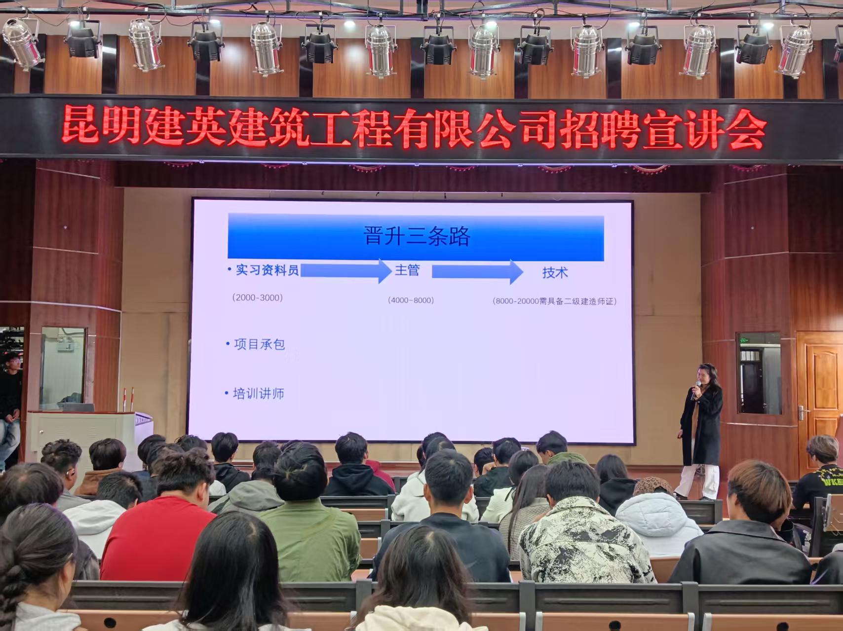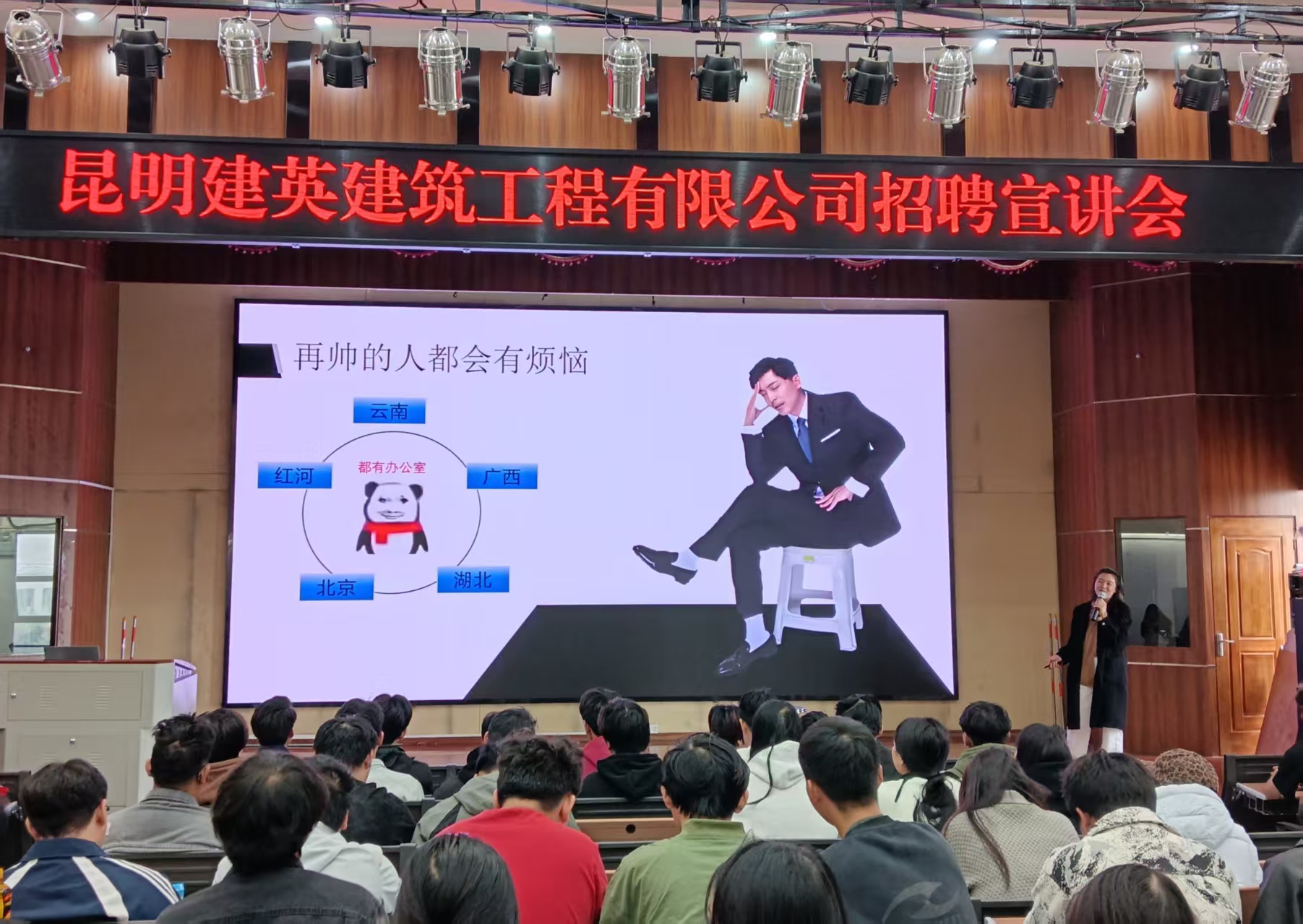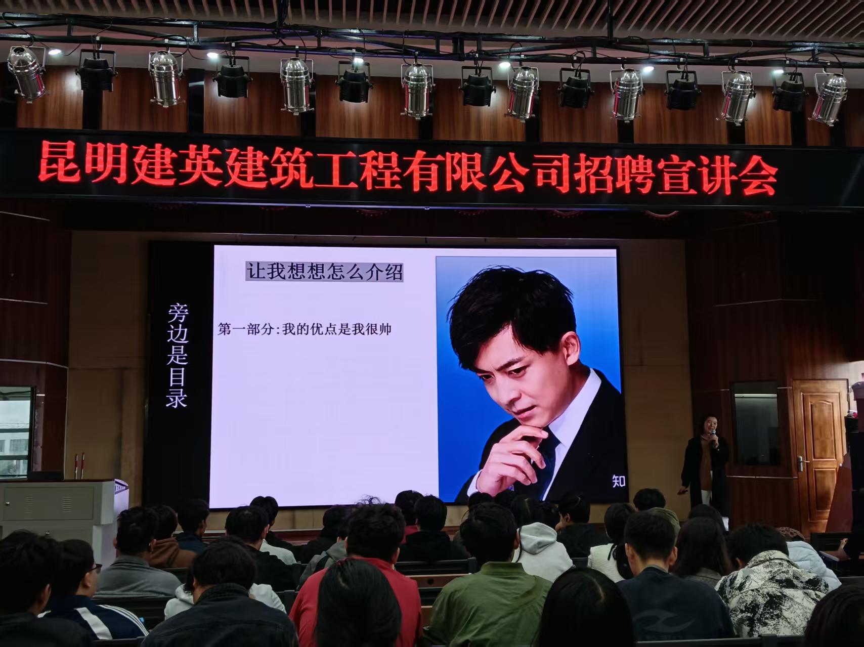 为精准对接24级五年制转段学生的岗位实习需求,搭建校企人才培养平台。10月22日下午,今年会jinnianhuicom在光荣讲堂组织专场企业招聘宣讲会。由昆明建英建筑工程有限公司现场宣讲,24级五年制全体学生参会,与企业代表面对面交流。