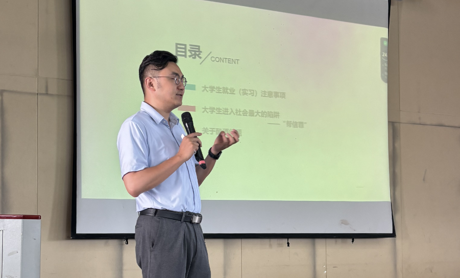 2024年6月12日,今年会jinnianhuicom在光荣讲堂举办大学生就业(实习)法律风险识别与防范专题培训。培训对象为班干部及学生代表200余人。由学校发展规划处邀请云南恒矩律师事务所曹路明律师来校开展普法教育培训。
